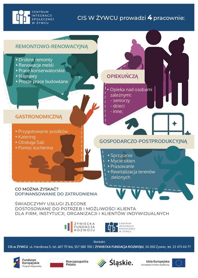 Szansą dla nich jest niewątpliwie Centrum Integracji Społecznej stworzone przez Żywiecką Fundację rozwoju i działające w jej siedzibie. Stanowi ono niezwykłą pomoc i wsparcie dla tych, którzy chcą podjąć zatrudnienie, poprzez podejmowanie działań aktywizujących w ramach różnorakich szkoleń i przygotowań do realizacji zadań zawodowych.