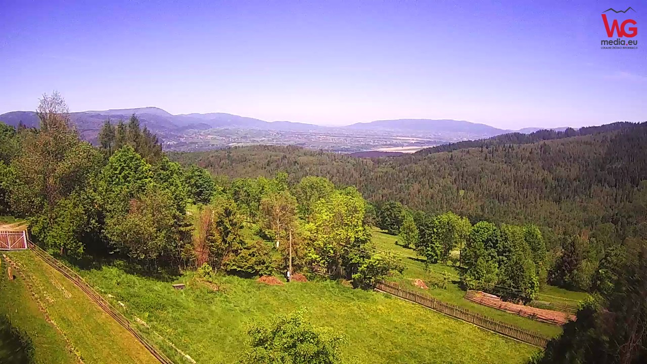 Widok na Cięcinę z przysiółka Fabisie z apartamentów Abrahamów. W oddali na lewym planie szczyt Skrzyczne 1 257 m n.p.m.