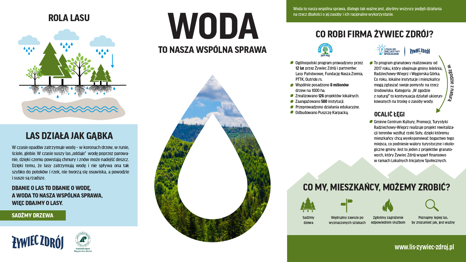 W ramach lokalnej kampanii „Woda to nasza wspólna sprawa”, firma Żywiec Zdrój zachęca do wspólnego działania na rzecz ochrony zasobów wodnych i przekonuje, że każdy ma realny wpływ na otaczające nas środowisko. Firma Żywiec Zdrój, w której DNA jest wpisana troska o naturę, a w tym przede wszystkim o zasoby wodne, pokazuje wraz z lokalnymi Partnerami, takimi jak samorządy, nadleśnictwa czy lokalni liderzy, że woda to sprawa każdego mieszkańca Żywiecczyzny i każdy z nas może podjąć działania, aby chronić zasoby wodne.