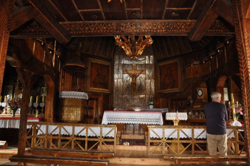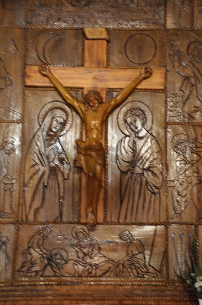 Charakterystyczna jest część, która jest głównym ołtarzem, gdzie widnieje wyrzeźbiony krzyż.