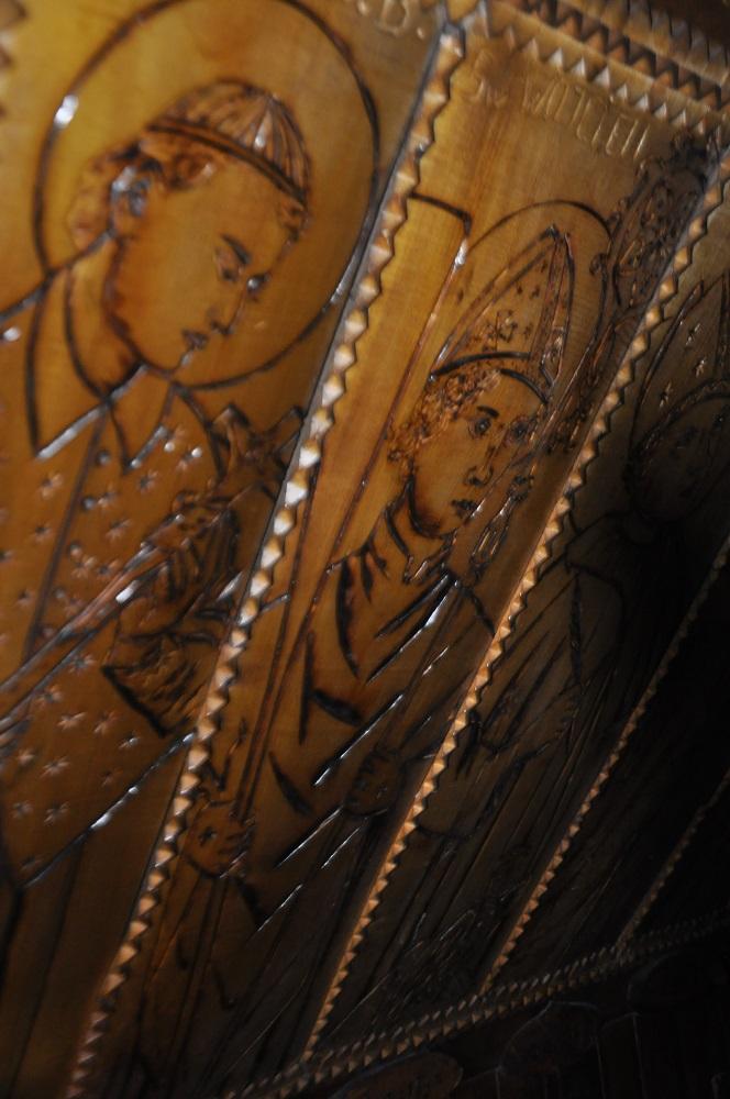 Widnieje tam bardzo ważna myśl, że „któraś z tych godzin jest ostatnia”. Na ścianach wypalone sceny przedstawiają całą biblię. Jest to tak zwana „Biblia dla ubogich”. Dawniej, gdy ludzie nie umieli czytać, ze scen przedstawionych na ścianach musieli odczytywać nauki biblijne. Techniką wypalania pokryty jest cały kościółek. Precyzja ręcznych robót jest ogromna, to trzeba być artystą – góralem i mieć niesamowity dar od Pana Boga by wykonać coś takiego. Przepięknie rzeźbione wnętrze wykonane zostało w dużej mierze przez artystę ludowego Jana Krężeloka z Koniakowa oraz ludowych twórców z Lalik.