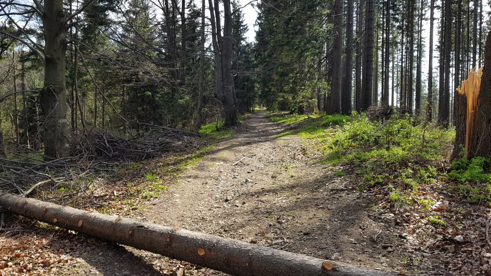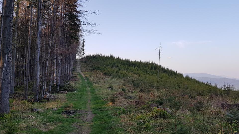 Po minięciu tablicy wspinamy się kilkaset metrów lasem, podejście stopniowo łagodnie, wznosząc się właśnie wśród lasu świerkowego, w którym możemy zaobserwować obumierające, przewrócone drzewa i wykroty stanowiące nie lada atrakcję i rozrywkę dla dzieci.