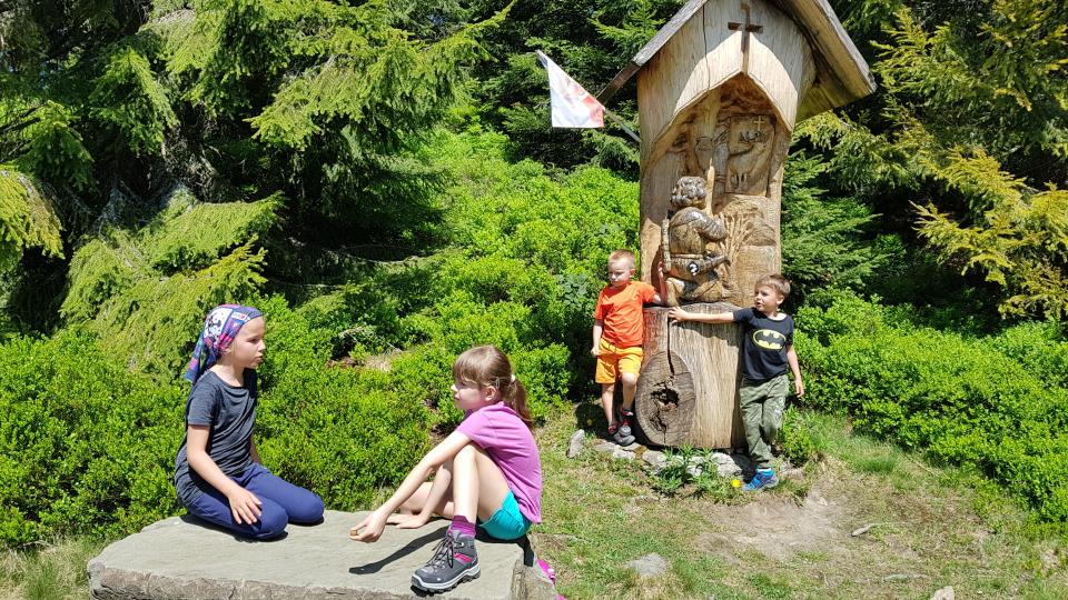 Kierujemy się cały czas prosto dalej za czarnym szlakiem, który wyprowadza nas w dolne rejony Hali Rysianka, na której znajduje się drewniana rzeźba św. Huberta oraz drewniane ławeczki. Idealne miejsce na odpoczynek i posiłek.