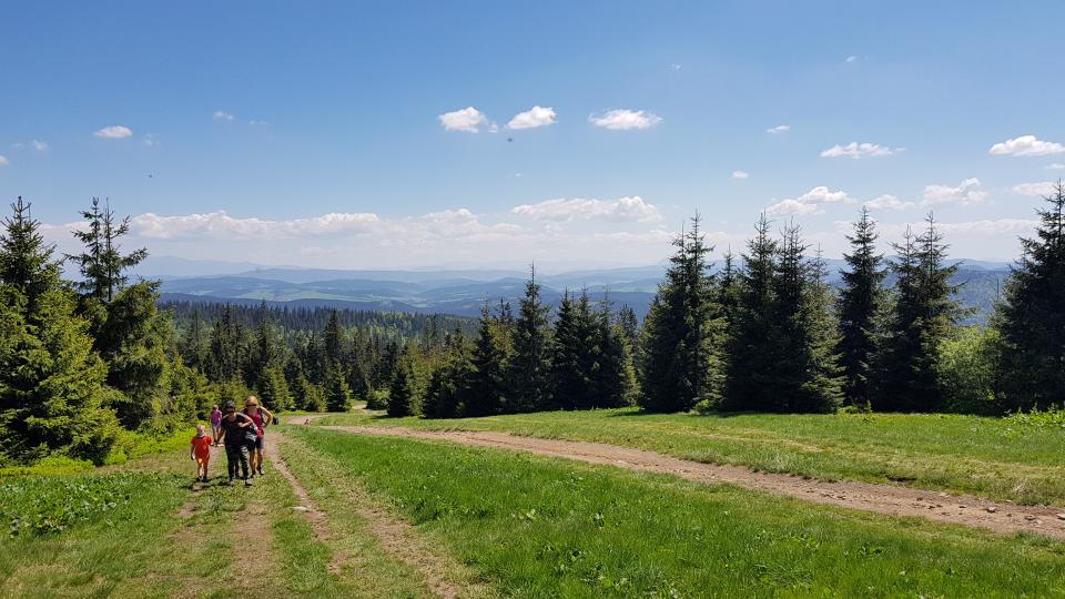 Teraz rozpoczynamy już schodzenie szlakiem niebieskim, najpierw przez las, w dolne rejony hali z przepięknym widokiem na Małą Fatrę.