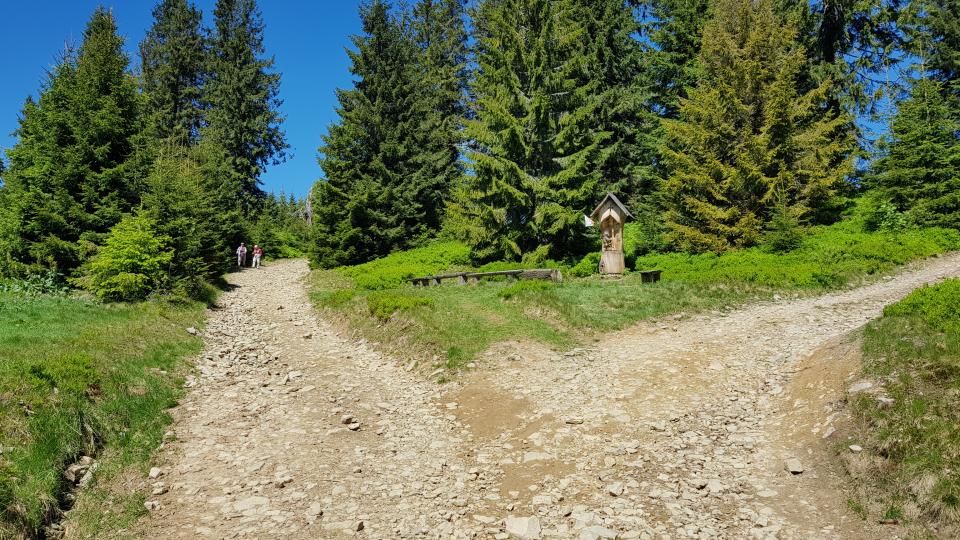 Droga pnie się powoli do góry i po około dwóch kilometrach docieramy do skrzyżowania ze szlakiem żółtym (będziemy nim schodzić), który w lewo odbija w stronę Hali Lipowskiej.
