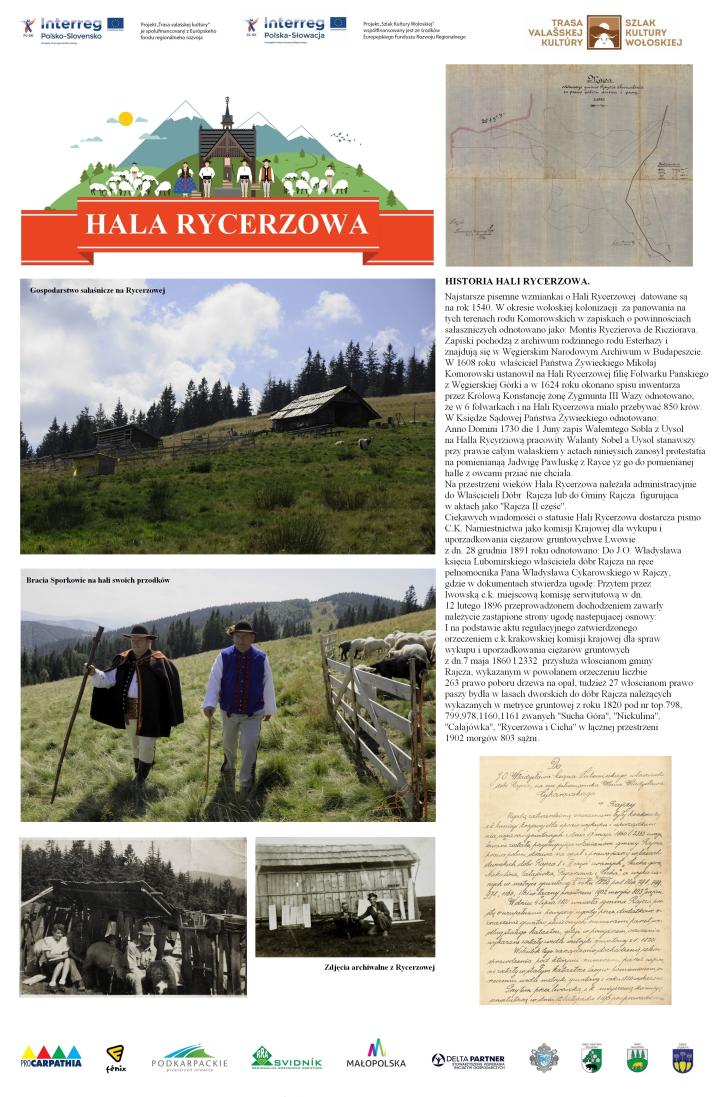 "Hala Rycerzowa zwana też Halą Sporkową, a przez Słowaków nazywana Bukoviną, to historyczna i unikatowa hala w Beskidzie Żywieckim. Położona jest na pograniczu polsko-węgierskim, obecnie polsko-słowackim. Jej początki sięgają XV w. Pierwsze pisemne wzmianki w języku polskim datowane są na rok 1608, w którym to roku właściciel Państwa Żywieckiego Mikołaj Komorowski ustanowił na Hali Rycerzowej Filię Folwarku Pańskiego z siedzibą w Węgierskiej Górce.