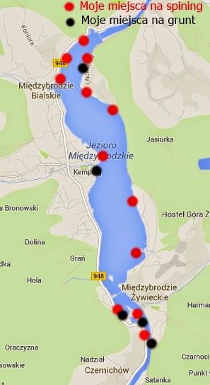 Jezioro można podzielić na 3 części: pierwsza część przy zaporze, druga to środkowa część jeziora i trzecia to cofka jeziora i rozlewisko. Gdzie i jaką metodą najlepiej łowić oznaczono na mapce: